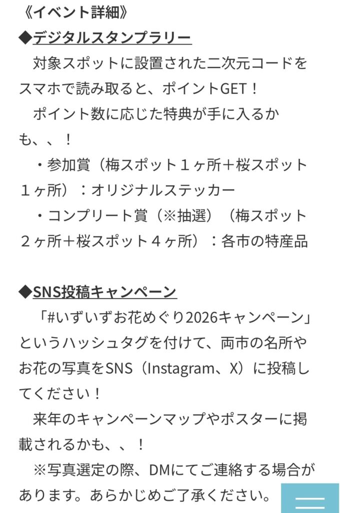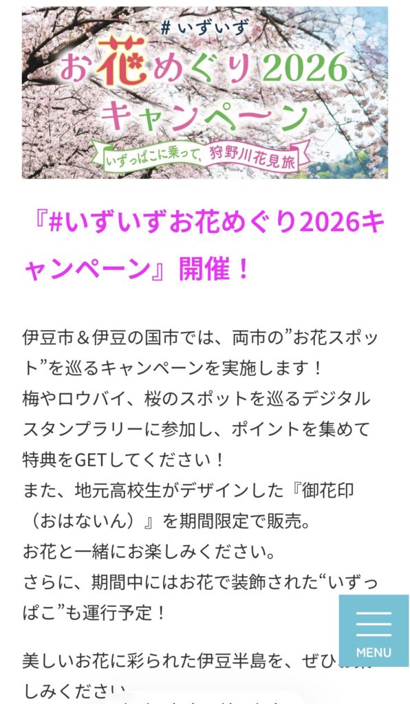 ~お花スポット~ 伊豆市By TANAPARK / 2025年12月15日 2026年に伊豆の国市・伊豆市にてお花巡りキャンペーンを紹介します。 Screenshot Screenshot 一部画像にて紹介しました。↓の画像は私が2025年に駐車場の前の河川敷から撮った写真です。期間とすると4月初め~4月15日が見所です(場所 伊豆市修善寺)よろしければご覧下さい・・お待ちしてま~す。 Screenshot